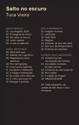 Em um percurso que na~o deixa de ser um mapeamento afetivo do autor – com diversidade de refere^ncias litera´rias, cinematogra´ficas, filoso´ficas, arti´sticas, histo´ricas e arquiteto^nicas – "Salto no escuro" conduz a novas pra´ticas de interac¸a~o urbana, a partir de instigantes e assustadoras reflexo~es sobre as novas configurac¸o~es espaciais das cidades. O renomado foto´grafo Tuca Vieira frequenta os mais di´spares e mu´ltiplos caminhos, centros urbanos, labirintos e criac¸o~es arti´sticas, munido de arcabouc¸o teo´rico e filoso´fico para ana´lises precisas e necessa´rias sobre a cidade contempora^nea e novas formas de interac¸a~o humana. Diversas expresso~es arti´sticas contempora^neas se entrecruzam nesse percurso – de Borges, Kafka e Vela´zquez a William Gibson, os poetas concretistas e artistas da Land Art. Diante da vertiginosa acelerac¸a~o da vida e ine´dita realidade impostas pela tecnologia, o autor instiga novas possibilidades e percepc¸o~es diante de uma experie^ncia progressivamente calculada e enquadrada virtualmente.