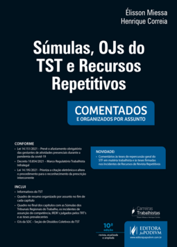 Em MAXIFORMATO para uma LEITURA OTIMIZADA e um MAIOR RENDIMENTO! Livro fundamental para quem atua na área trabalhista! Comentários às teses de repercussão geral do STF em matéria trabalhista e às teses firmadas nos Incidentes de Recursos de Revista Repetitivos. O LEITOR ENCONTRARÁ: - Informativos do TST - Quadro de resumo organizado por assunto no fim de cada capítulo - Súmulas dos Tribunais Regionais do Trabalho - OJs da SDC – Seção de Dissídios Coletivos do TST CONFORME: - Lei 14.151/2021 – Prevê o afastamento obrigatório das gestantes de atividades presenciais durante a pandemia da covid-19 - Decreto 10.854/2021 – Marco Regulatório Trabalhista Infralegal QUEM RECOMENDA: Não se pode minimizar o relevante papel que desempenham os tribunais na construção do Direito no Brasil. A força normativa da jurisprudência é uma característica marcante do Direito brasileiro contemporâneo. O novo CPC foi estruturado a partir desta premissa. A Justiça do Trabalho há muitos anos reconhece a normatividade da jurisprudência. O TST não só muito bem organiza os seus precedentes como vela pelo respeito que eles merecem. É com prazer, então, que faço este prefácio ao livro de Élisson Miessa e Henrique Correia. Eles examinaram detidamente a consolidação da jurisprudência do TST, nos enunciados da súmula e das orientações jurisprudenciais. Não bastasse o exame rigoroso, eles organizaram os enunciados por tema. O livro é utilíssimo. Daqueles que devem estar sempre ao alcance das mãos – e não nas prateleiras mais altas de nossa biblioteca. Saúdo a editora e os autores. O leitor perderá muito se não avançar imediatamente para as páginas seguintes deste belo livro. FREDIE DIDIER JR. ______ O livro, da forma como enfocado o tema, é pioneiro, pois todo o trabalho foi desenvolvido numa visão sistêmica e integrada dentro do contexto prático do Direito e do Processo do Trabalho e da jurisprudência sumulada do C. TST, que é o responsável pela uniformização do Direito do Trabalho em todo o Brasil por meio da sua jurisprudência pacificada. Na presente obra, os autores trataram do tema da jurisprudência trabalhista sob uma nova ótica, diferente de tudo o que até então já foi feito por outros doutrinadores, permitindo que o operador do Direito do Trabalho, numa rápida e fácil pesquisa tenha contato com a jurisprudência por temas específicos e com os respectivos comentários dos autores de forma clara e objetiva. Quem não conhece a jurisprudência certamente terá grandes dificuldades para entender e operar o Direito, daí a grande importância prática da referida obra. O livro dos doutores Henrique Correia e Élisson Miessa, sem paradigma na doutrina brasileira, apresenta-se como instrumento indispensável aos operadores do Direito do Trabalho (juízes, membros do Ministério Público, advogados, professores e estudantes de Direito). Parabéns aos autores pela iniciativa, à Editora Juspodivm, pelo patrocínio da obra, e ao leitor, que será o maior beneficiado com o trabalho. RAIMUNDO SIMÃO DE MELO